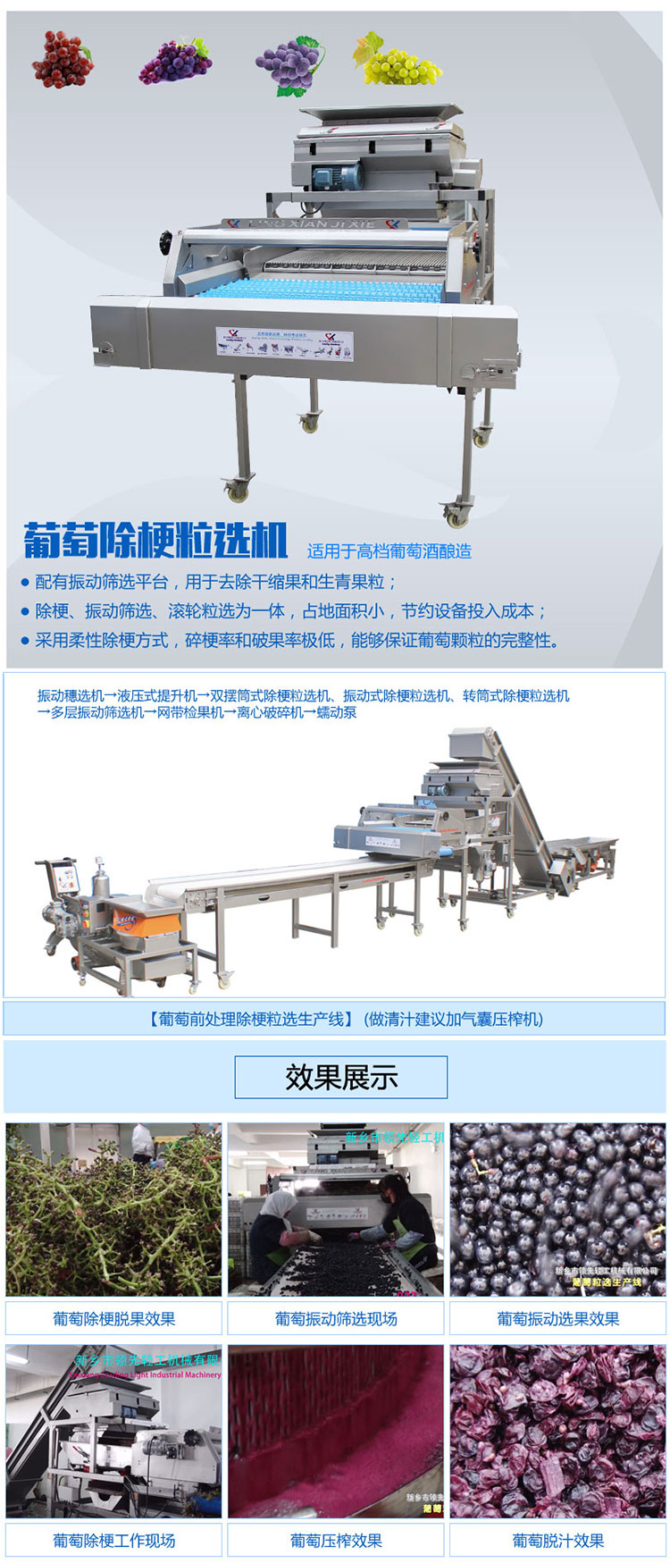 该机引进法国技术精心设计而成,集除梗、振动粒选、辊轮精选为一体。具有结构紧凑、效率高、除梗率高等优点。以成熟度较好的赤霞珠为例,果内带梗率为0.2%—0.5%。目前张裕巴保男爵、天塞酒庄、宁夏贺兰神国际酒庄等国内近30家酒庄使用。性能稳定,技术成熟。