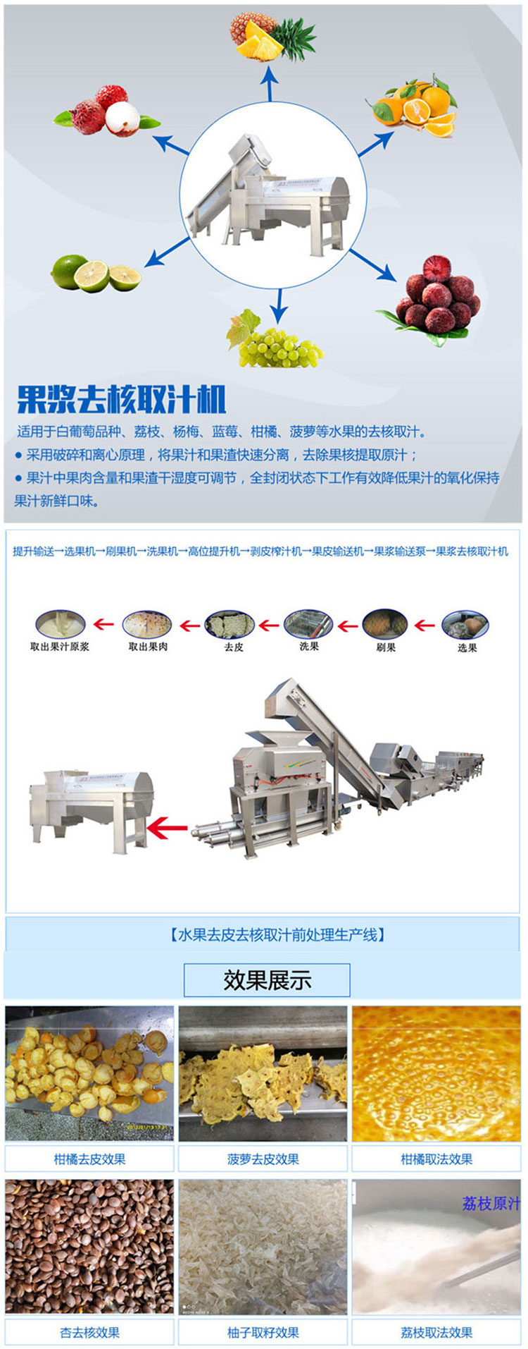 该机是借鉴台湾技术,主要用于各种水果榨取原汁。采用破碎和快速离心相结合的原理,可将果汁和果渣快速分离,并有效去除果核,由于该机在全封闭状态工作能有效降低果汁的氧化。广泛适用于白葡萄品种、荔枝、杨梅、蓝莓、柑橘、菠萝等水果的取汁。果汁中固形物含量和果渣干湿度都可以调节。